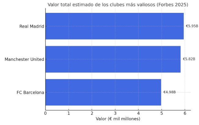 Según la prestigiosa revista Forbes, que cada año publica el ranking de los clubes más valiosos del mundo como si fueran empresas, el Real Madrid encabeza la lista en 2025 con una estimación de $6.75 mil millones, lo que equivale a unos €5.95 mil millones.