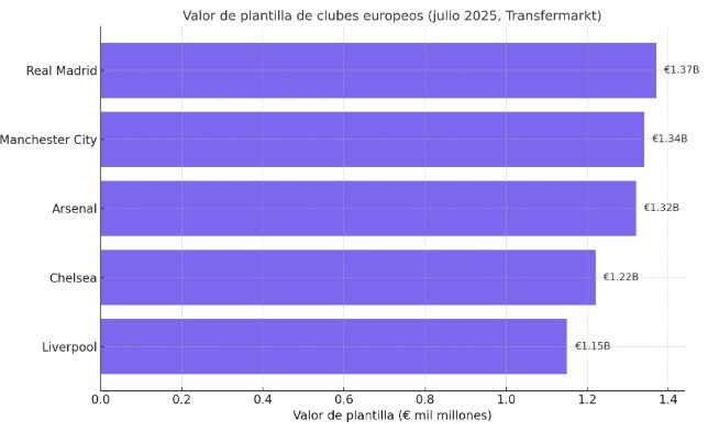 Según datos de julio de 2025, estos son algunos de los clubes con mayor valoración de plantilla: