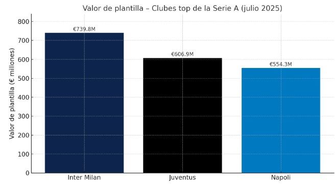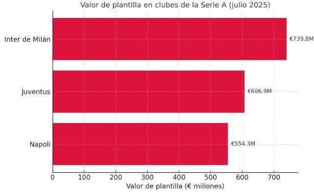 Inter Milan, Juventus y Napoli son tres equipos del Calcio que superan los € 500 millones según Transfermarkt (corte julio‑2025):