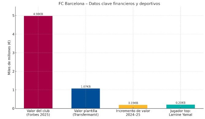 Jugadores jóvenes como Lamine Yamal (valorado en €200 m), Pedri y Raphinha han fortalecido su plantilla. Fundado en 1899, el Barça combina cantera (La Masia), estilo de juego e identidad global, lo que justifica su peso como uno de los valiosos.