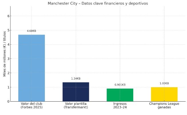 Valor de plantilla de €1.34 bn según Transfermarkt. Desde que el City Football Group tomó control, el club ha invertido en infraestructura, estrellas y academias globales. En 2023‑24 generó $901 m en ingresos.