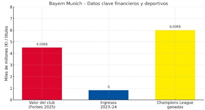 Con 6 Champions, dominio incontestable en Bundesliga y cantera de jugadores de clase mundial, su éxito y modelo económico (autofinanciado y sólido) le han permitido liderar también comercialmente. Borussia Dortmund es el otro alemán en la posición 12 con $2.05 bn.