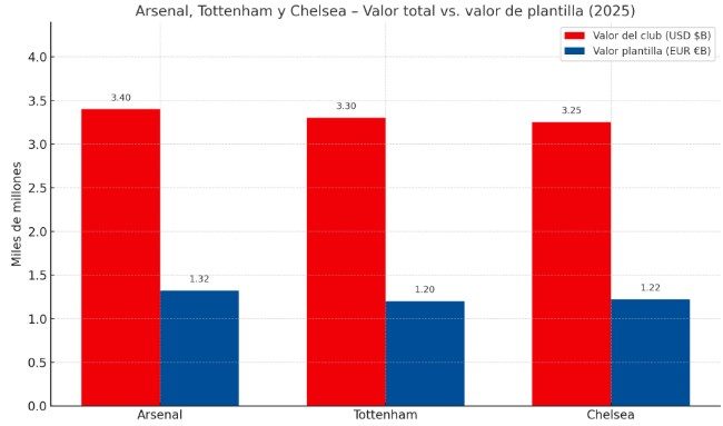 Todos superan holgadamente los € 500 millones y sus plantillas valoradas por Transfermarkt —Arsenal €1.32 bn, Chelsea €1.22 bn, Tottenham en similar rango— confirman la tendencia.