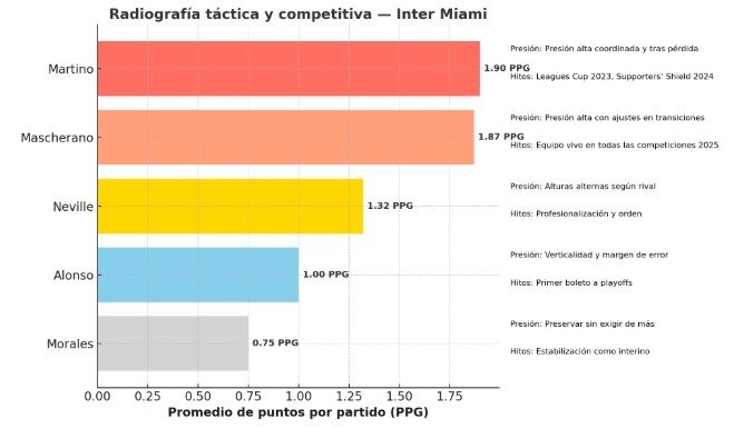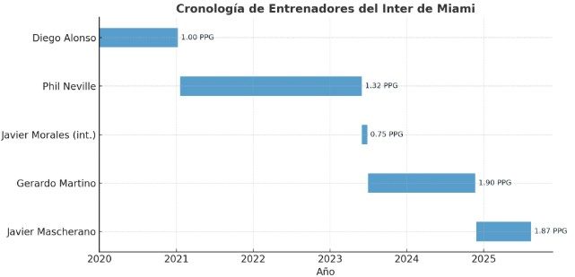 La historia de Inter Miami desde la banda es la historia de su madurez. Alonso demostró que el club no iba a ser un experimento; Neville sostuvo la transición y dejó una base profesional; Martino convirtió al equipo en campeón y elevó el estándar competitivo; Morales estabilizó; y Mascherano perfecciona la continuidad, con una media de puntos que invita a soñar con más títulos.
