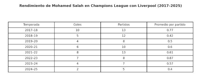 Para entender mejor cómo se ha comportado Salah en Champions, miremos sus cifras por temporada. Esto no solo permite visualizar su impacto por año, sino también ver cómo se adaptó y evolucionó.