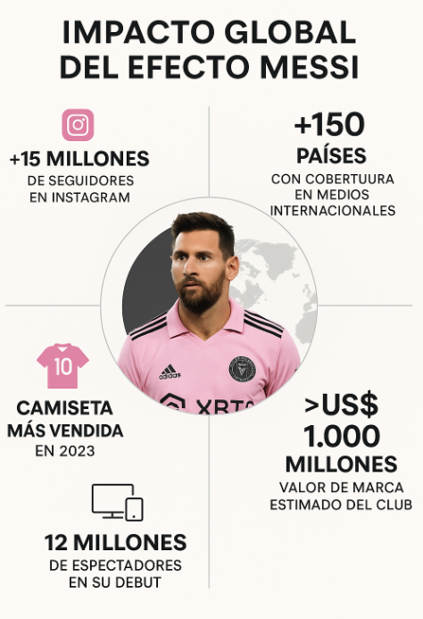 La llegada de Lionel Messi al Inter de Miami marcó un antes y un después no solo para el club, sino para toda la Major League Soccer. Desde su fichaje en julio de 2023, el impacto mediático y comercial ha sido inmediato: el equipo duplicó su número de seguidores en redes sociales en menos de una semana y superó los 15 millones de seguidores en Instagram, posicionándose como el club más seguido de Estados Unidos. El efecto Messi también disparó las ventas de camisetas —la camiseta rosa número 10 fue la más vendida del planeta en 2023, según Fanatics— y multiplicó el valor de marca del club, estimado en más de US$ 1.000 millones, de acuerdo con Forbes.