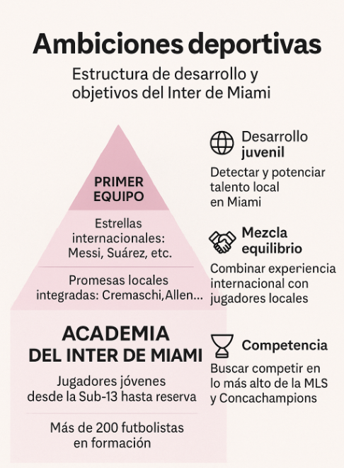El club, sin embargo, no se conforma con los resultados inmediatos. La directiva liderada por Jorge Mas y David Beckham ha proyectado un modelo de crecimiento que prioriza la sostenibilidad deportiva. En este marco, el desarrollo juvenil ocupa un rol central. La Academia del Inter de Miami, inaugurada en 2020, cuenta con más de 200 jóvenes jugadores en distintas categorías, entrenando bajo estándares profesionales y con un enfoque integral que combina formación técnica, educación y disciplina.