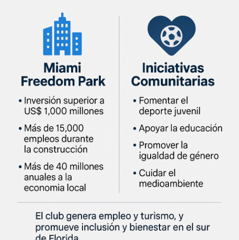 El impacto del Inter de Miami trasciende lo deportivo. Desde su fundación, el club ha asumido un rol activo en el desarrollo económico y social del sur de Florida, convirtiéndose en un motor de empleo, inversión y cohesión comunitaria. La construcción del Miami Freedom Park, con una inversión superior a US$ 1.000 millones, es el eje de este impulso. Según proyecciones de la ciudad, el proyecto generará más de 15.000 empleos directos e indirectos durante su fase de construcción y aportará más de US$ 40 millones anuales a la economía local una vez en funcionamiento.