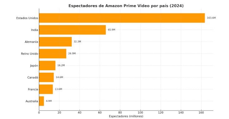 En Europa, Alemania y el Reino Unido lideran con 32,3 y 26,9 millones de espectadores respectivamente. Japón y Canadá también tienen una base sólida, mientras que Francia y Australia completan el grupo con cifras más modestas pero igualmente relevantes. Este desglose muestra que Prime Video no depende de un solo mercado: su expansión es realmente global, y su éxito está en saber adaptarse a los gustos y costumbres de cada país.