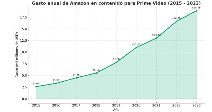 El gasto en contenido de Prime Video ha seguido una curva ascendente que refleja algo más que ambición: una estrategia clara por posicionarse como uno de los grandes jugadores del streaming. En 2015, la inversión apenas superaba los 2.000 millones de dólares. Ocho años después, Amazon destinó 18.900 millones, lo que representa un salto brutal y sostenido, sin retrocesos.