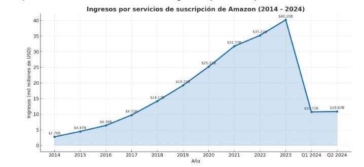 A lo largo de la última década, los ingresos por suscripción de Amazon han tenido un crecimiento realmente impresionante. Lo que comenzó en 2014 como una fuente secundaria de ingresos, hoy representa una parte fundamental del negocio. El aumento constante año tras año demuestra que los usuarios no solo están dispuestos a pagar por Prime Video o envíos rápidos, sino por el conjunto de servicios integrados que ofrece Amazon.
