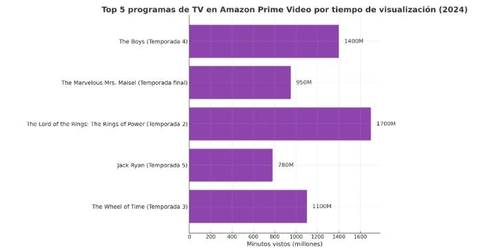 Muy cerca le sigue The Boys (temporada 4), con 1.400 millones de minutos reproducidos en su primer mes. Esta serie ya es un clásico moderno de Prime Video, y su éxito se debe tanto a su tono irreverente como a su capacidad para renovar el interés con cada temporada. También destacan The Wheel of Time y The Marvelous Mrs. Maisel, que, a pesar de ser propuestas muy distintas, muestran que la plataforma logra conectar con públicos diversos.