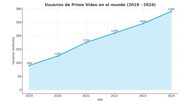 El gráfico habla por sí solo: Prime Video ha vivido un crecimiento sostenido en los últimos seis años. En 2019 contaba con 90 millones de usuarios, y hoy ya suma 290 millones. Eso no solo refleja una buena estrategia de expansión, también muestra que la plataforma ha sabido adaptarse a lo que la gente busca. Ya no se trata solo de tener muchas series, sino de ofrecer experiencias personalizadas, títulos relevantes y una navegación amigable.