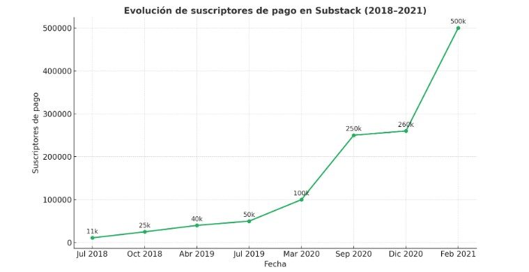 El gráfico habla por sí solo: Substack creció a un ritmo impresionante entre 2018 y 2021. En menos de tres años pasó de 11.000 a más de 500.000 suscriptores de pago. La mayor aceleración se dio entre marzo y septiembre de 2020, en plena pandemia. En ese periodo, muchas personas buscaron nuevas formas de trabajar y consumir contenido, y Substack fue una respuesta rápida a esa necesidad.
