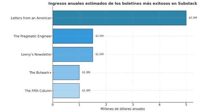 Más abajo en la lista, pero igual de sólidos, están The Bulwark+ y The Fifth Column, con un millón de dólares anuales cada uno. Estos boletines muestran que hay espacio para voces distintas, desde el análisis político hasta el comentario cultural. Lo que los une no es el tema, sino la capacidad de sostener una audiencia que paga por seguir leyendo.