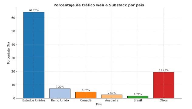 Substack es, ante todo, una plataforma con fuerte presencia en Estados Unidos. Más del 64 % del tráfico web proviene de ese país. Esto no sorprende: la mayoría de los autores más populares escriben en inglés y tienen una base de lectores estadounidense. Sin embargo, el dato también marca una clara concentración geográfica.