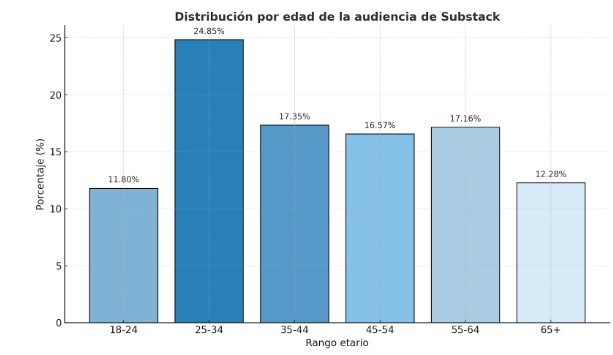 El gráfico también muestra que Substack no es solo para jóvenes ni exclusivamente para adultos mayores. La distribución es bastante balanceada, con cada grupo aportando una fracción significativa de la audiencia. Incluso el grupo de 65 años o más, con un 12,28 %, tiene una presencia respetable.