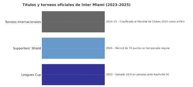 Desde su debut en la MLS en 2020, Inter Miami ha ganado dos títulos oficiales: la Leagues Cup 2023, tras una dramática definición por penales ante Nashville SC, y el Supporters’ Shield 2024, donde rompió el récord de puntos en temporada regular con 74 unidades. Además, el club ha clasificado al Mundial de Clubes 2025 como anfitrión y ha tenido destacadas participaciones en torneos regionales como la Concacaf Champions Cup.