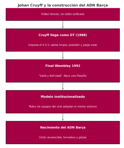 Cruyff no solo cambió la forma de jugar: institucionalizó una filosofía. Exigió que todos los equipos del club, desde infantiles hasta el primer equipo, jugaran con la misma idea táctica. Así nació el “ADN Barça”.