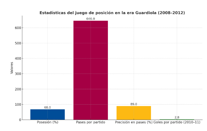 Durante el apogeo del Barça de Guardiola, el equipo alcanzó un promedio de 69% de posesión, marcó 2,8 goles por partido y registró un impresionante 72% de canteranos en el once inicial. Fue el momento más alto en términos de control del juego y protagonismo de jugadores formados en La Masía.