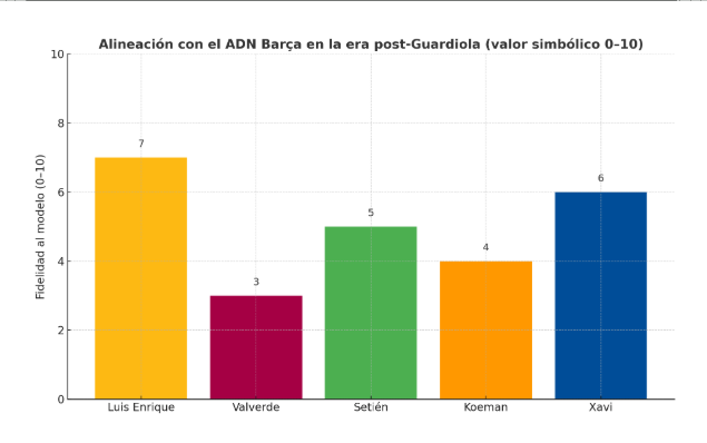 - Xavi (2021–2024) reintrodujo conceptos clave del ADN Barça, pero con altibajos y resultados irregulares.
