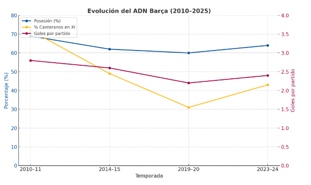 La identidad del FC Barcelona no solo se mide por sensaciones o estilos visuales en la cancha, también se puede cuantificar a través de métricas clave. A continuación, se presenta una evolución de tres indicadores fundamentales que reflejan la fidelidad (o desvío) del club respecto a su ADN futbolístico: la posesión del balón, la capacidad ofensiva y el protagonismo de los canteranos en el once titular.